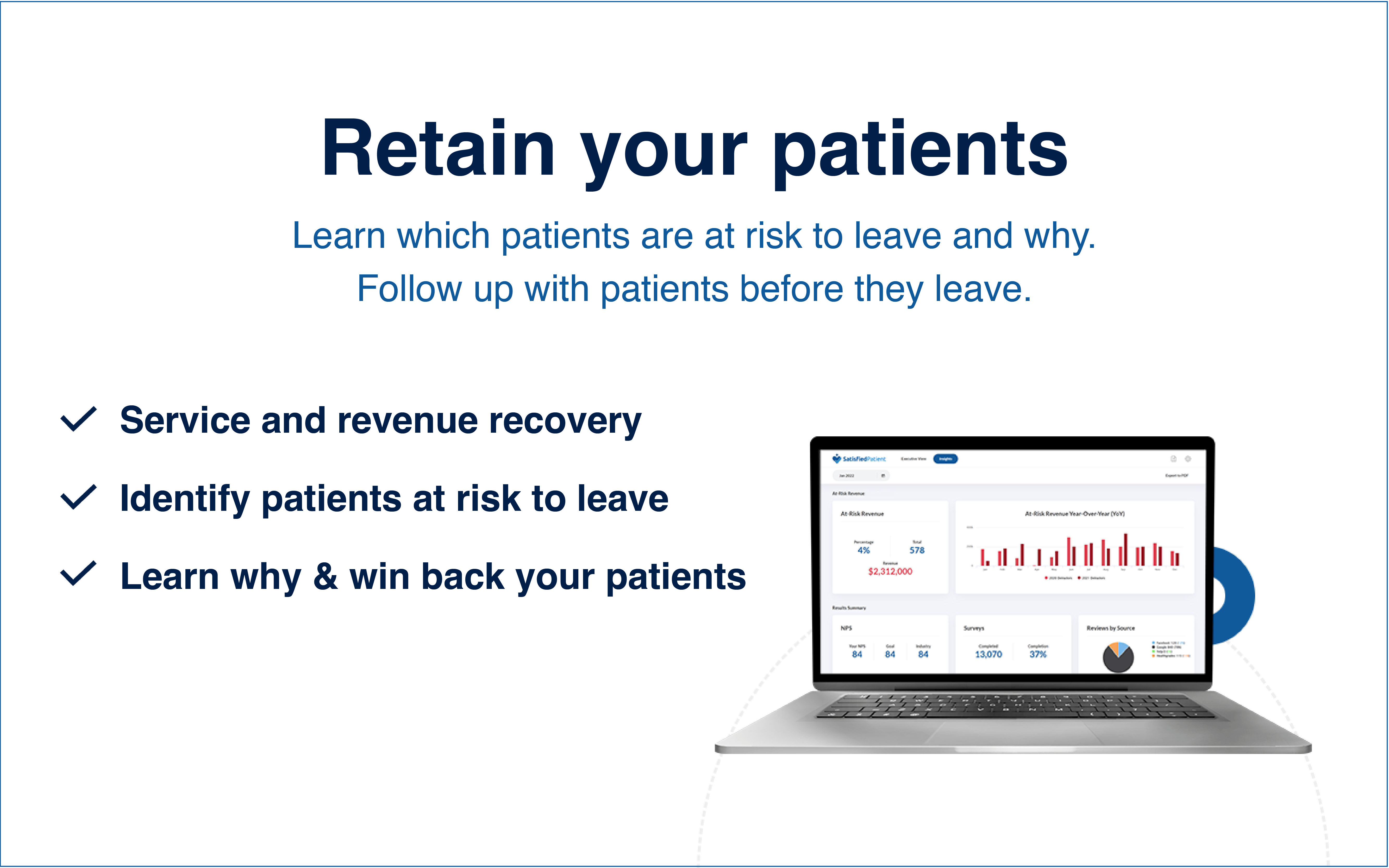 Satisfied Patient helps you manage your online reputation and retain existing patients. Collect online reviews, acquire new patients, recover lost revenue, and improve every patient experience with customized insights. Stop losing patients. Start dominating online review platforms like Google, Facebook, and Healthgrades now. Take your patient satisfaction to a new level with customized patient insights. We combine technology and patient insights to help you listen better, act faster and outperform the competition. Learn which patients are at risk of leaving your practice and why. Increase your revenue and focus on what’s most important to grow and maximize your profitability. Join us, and see how we do all the work for you.